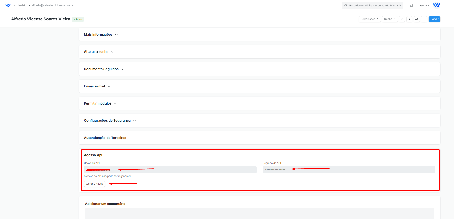 - Caso não lembre sua Chave e Segredo e de acesso, é necessário gerar uma outra(use o botão gerar da imagem informada).